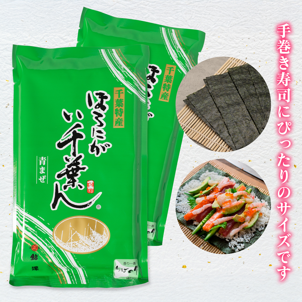 商品概要:千葉県木更津産の希少な青混ぜ焼のりを使用した「ほろにがい千葉ん」です。 豊かな磯の香りとほどよいほろ苦さが特徴で、全型・半切の2サイズ入り。 開封後も保存袋付きで風味を保ちながらお使いいただけます。