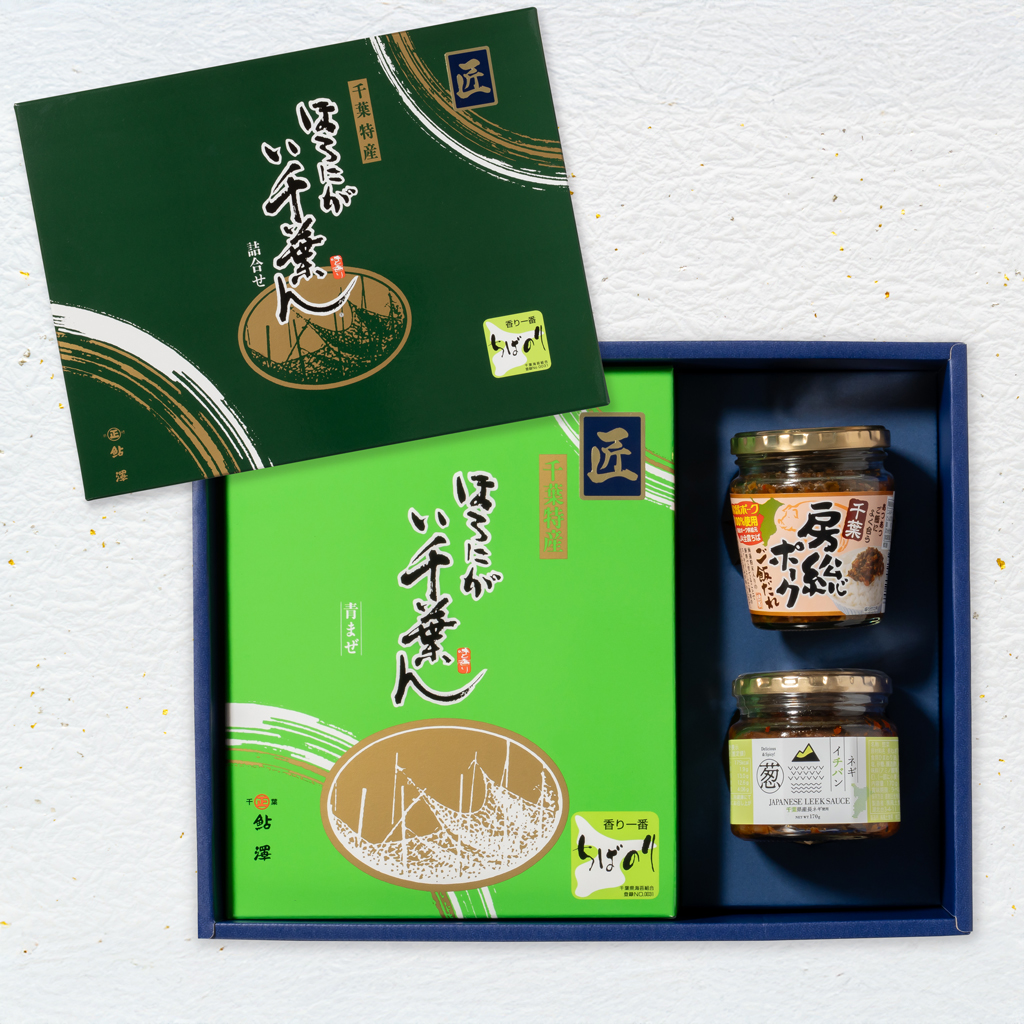 商品概要:千葉県木更津産青混ぜのりと千葉名産瓶詰2種の詰合せです。