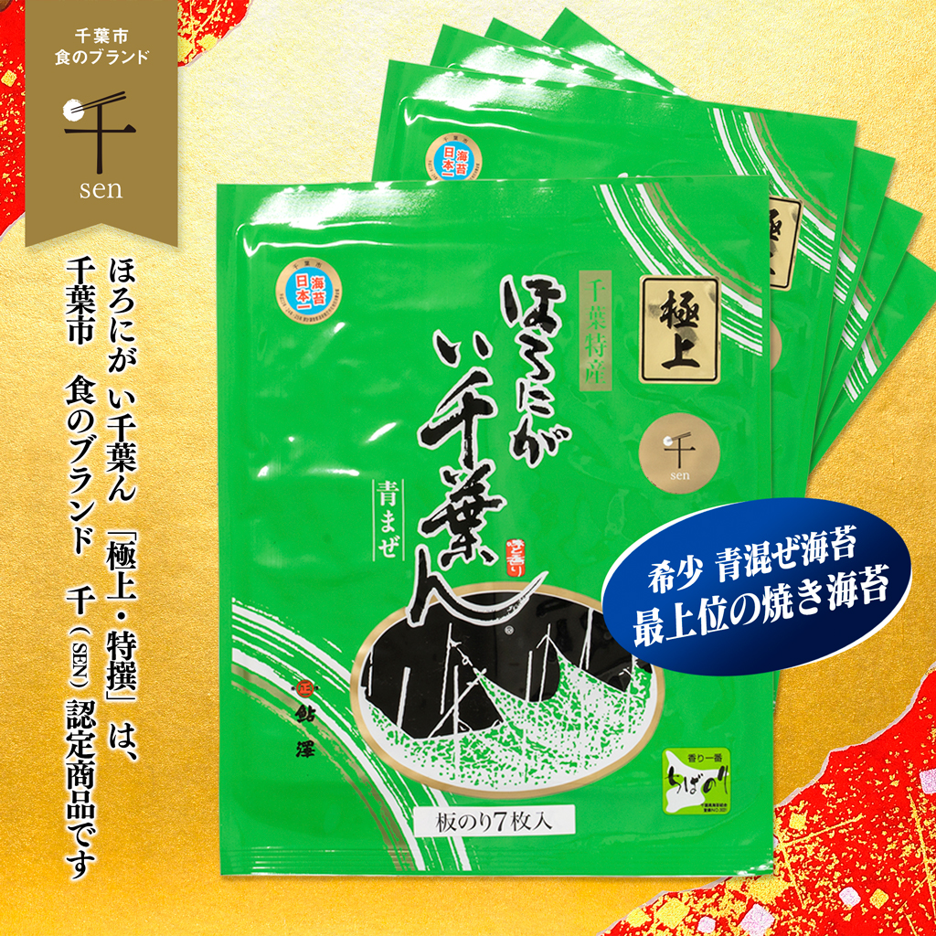 「ほろにがい千葉ん」は、千葉県木更津で収穫された青混ぜ海苔の中でも、特に品質の高いものだけを厳選して使用した焼き海苔です。