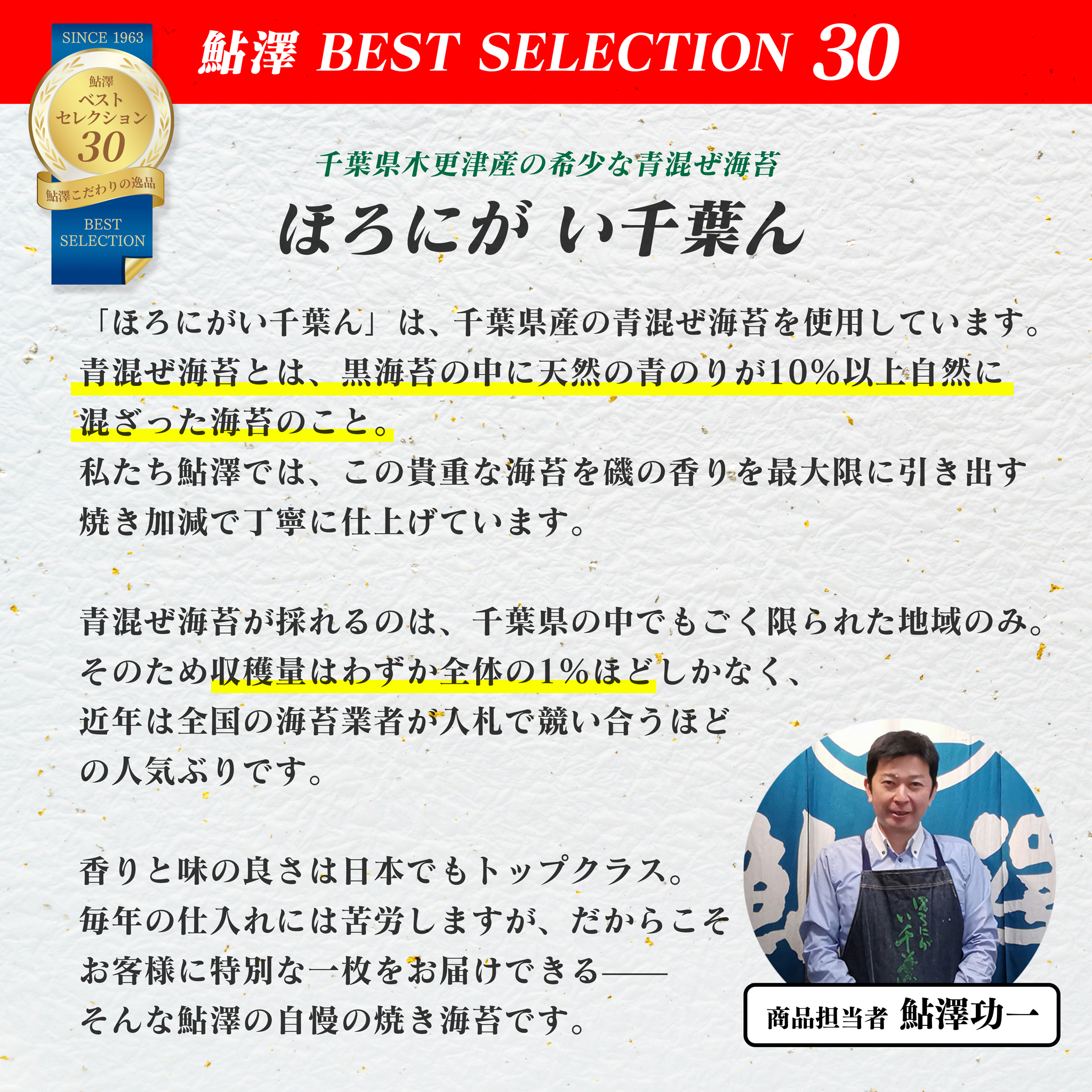 「ほろにがい千葉ん」は、千葉県木更津で収穫された青混ぜ海苔の中でも、特に品質の高いものだけを厳選して使用した焼き海苔です。