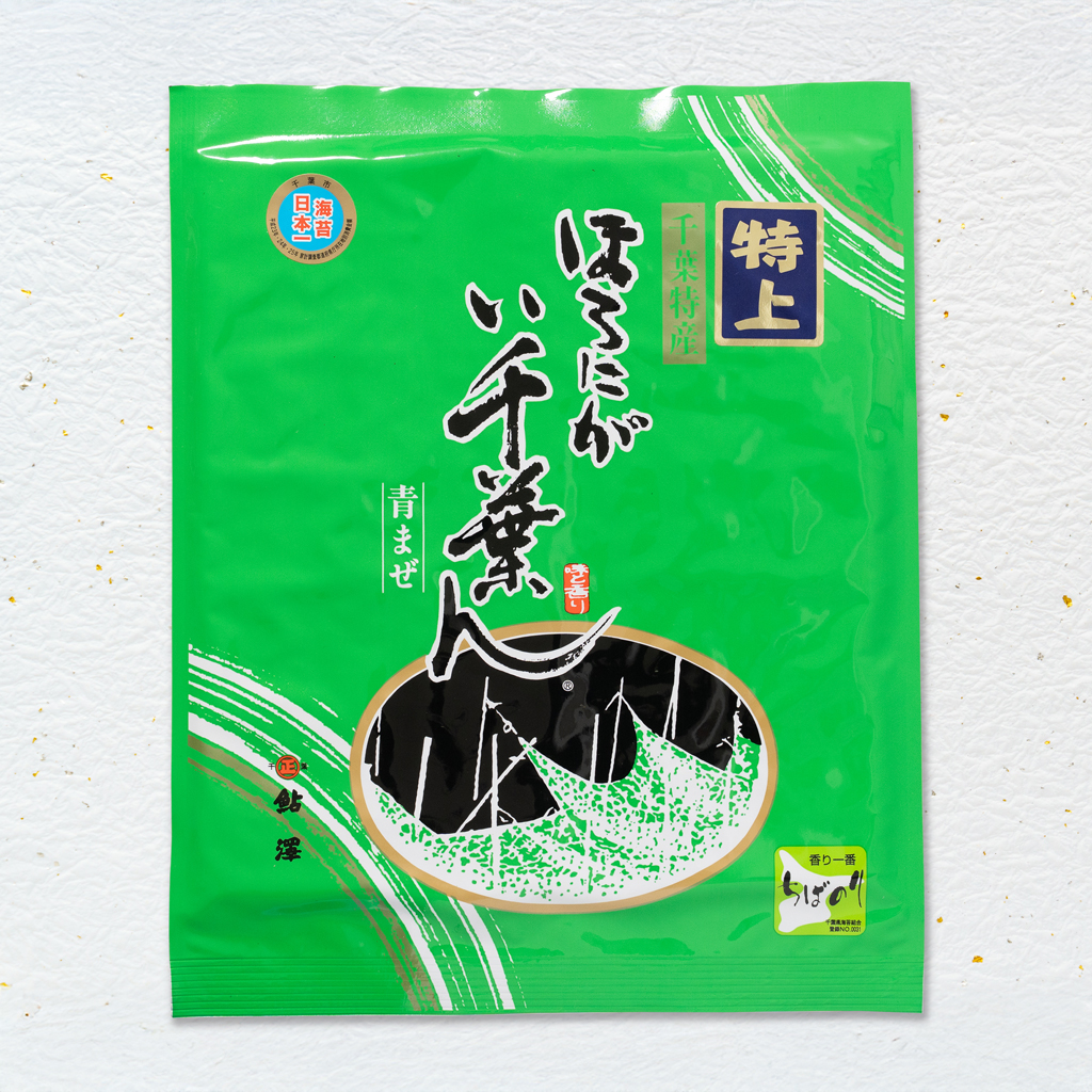 「ほろにがい千葉ん」は、千葉県木更津で収穫された青混ぜ海苔の中でも、特に品質の高いものだけを厳選して使用した焼き海苔です。