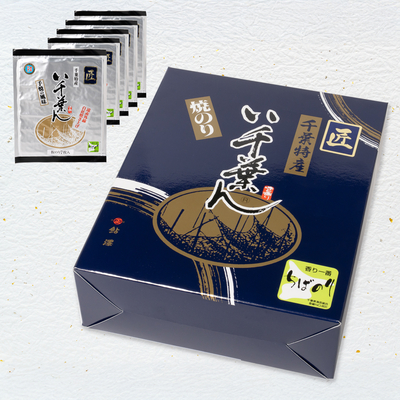 鮎澤の「い千葉ん」は、江戸前千葉海苔の産地「船橋」・「行徳」で収穫された黒海苔を厳選して使用した焼き海苔です。